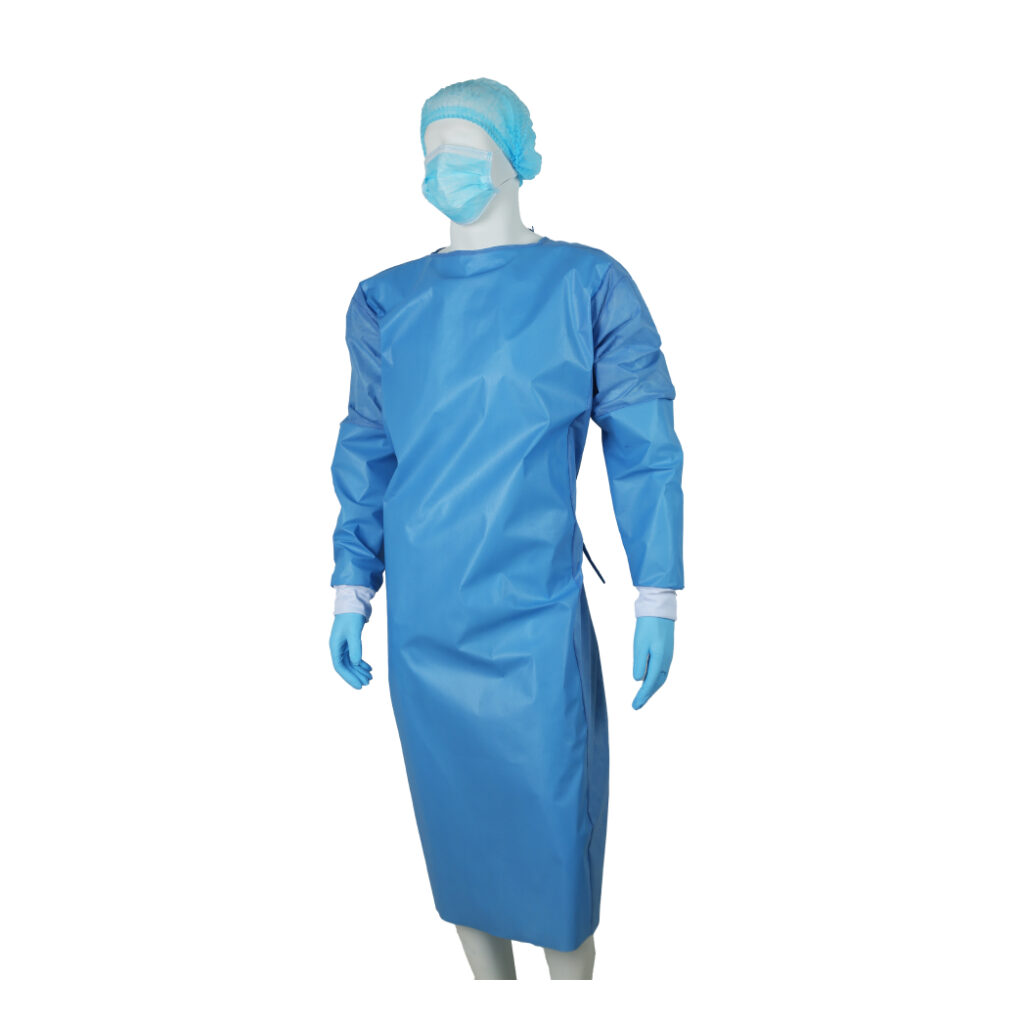 Made of 35 g SMS fabric Front and sleeves in anti-fluid fabric. Neck and waist support with two tie straps Cotton cuff One size Presentation Sterile and non-sterile. Packaging: Package of 10 Units