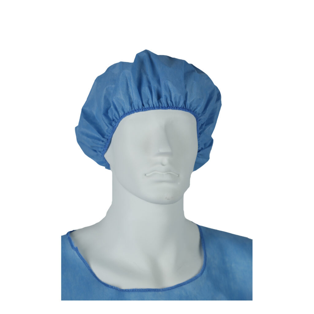 Round cap with spring Made of blue or white SMS fabric 35 g Spring-loaded, diameter 50 cm Yarn covering Does not mark the forehead Packaging: Package of 50 Units